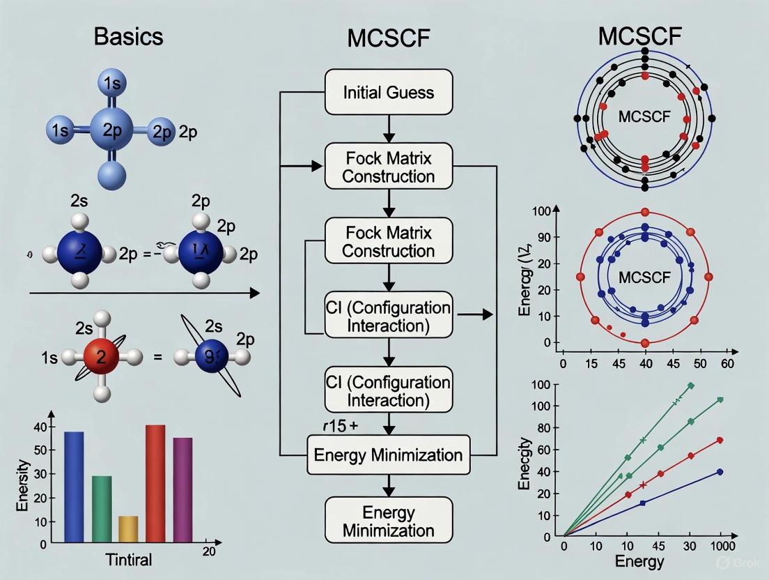 The fundamental theoretical framework of MCSCF expands upon the Hartree-Fock approach by expressing the total electronic wavefunction as a linear combination of Slater determinants, represented as: